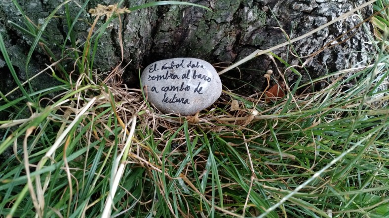 Dejé la piedra, con su cuento caligrafiado a mano, en aquel mismo lugar. Es probable que aún siga ahí, o puede que la naturaleza o el hombre la hayan llevado a otro lugar. Si encuentras a El árbol y las hojas o tienes noticias suyas, por favor cuéntanos lo que sepas en los comentarios a esta entrada: cuándo la viste, dónde, qué sentiste al encontrarla, si tiene buen aspecto, si se le está borrando el texto… cualquier cosa. Si tienes la oportunidad de fotografiarla, te agradecería que enviaras la imagen para compartirla aquí y hacer un álbum histórico.