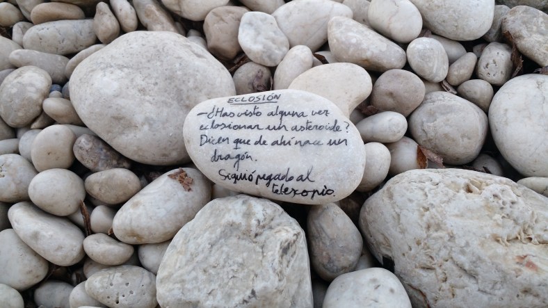 El microrrelato escrito en piedra Eclosión fue creado en la cala El Racó de Calpe (Alicante, España) el 5 de agosto de 2017.