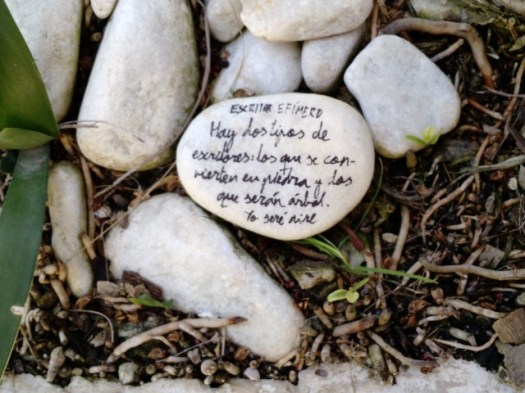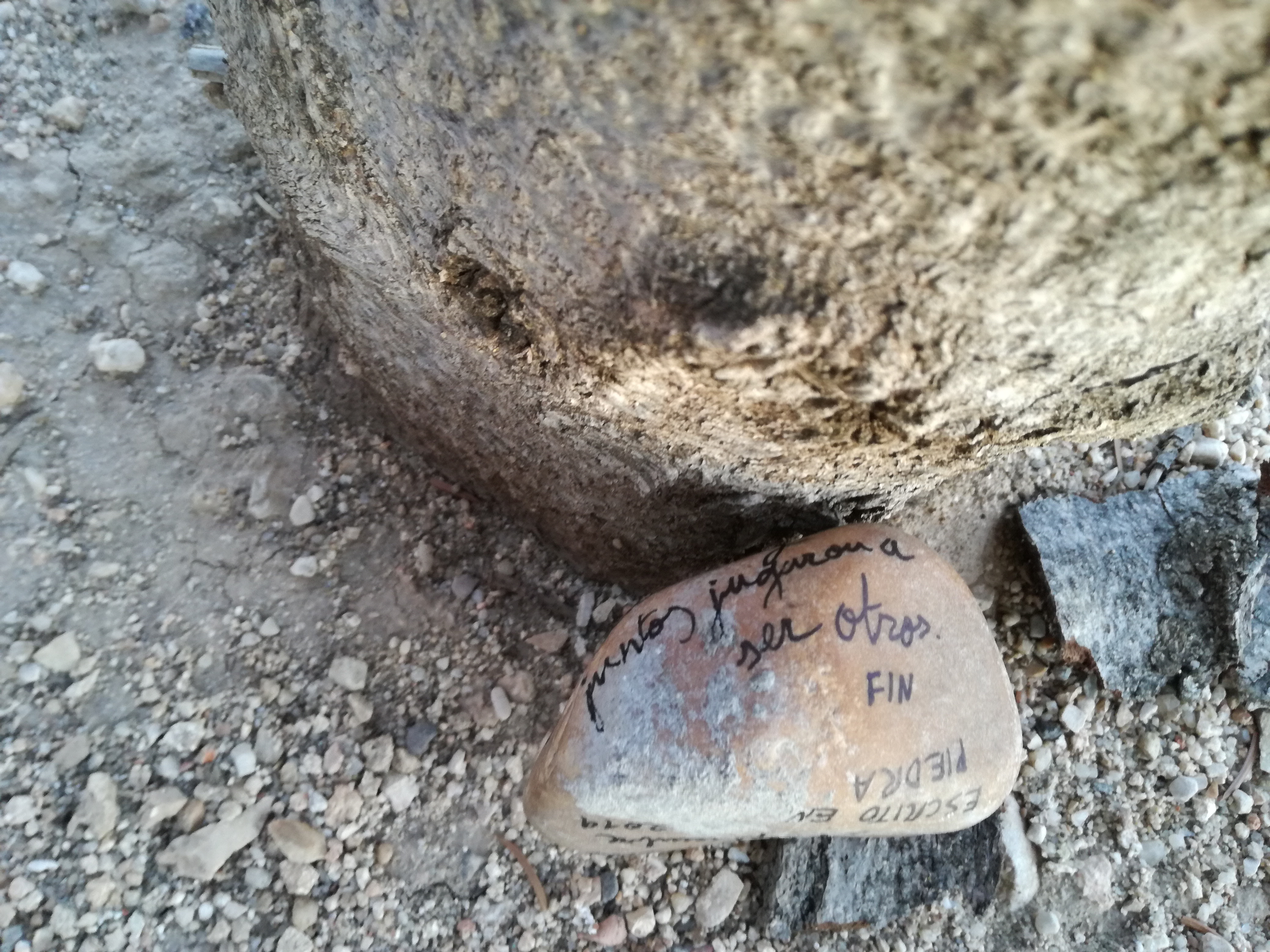 Dejé la piedra, con su cuento caligrafiado a mano, en aquel mismo lugar. Es probable que aún siga ahí, o puede que la naturaleza o el hombre la hayan llevado a otro lugar. Si encuentras a Eclosión o tienes noticias suyas, por favor cuéntanos lo que sepas en los comentarios a esta entrada: cuándo la viste, dónde, qué sentiste al encontrarla, si tiene buen aspecto, si se le está borrando el texto… cualquier cosa. Si tienes la oportunidad de fotografiarla, te agradecería que enviaras la imagen para compartirla aquí y hacer un álbum histórico.